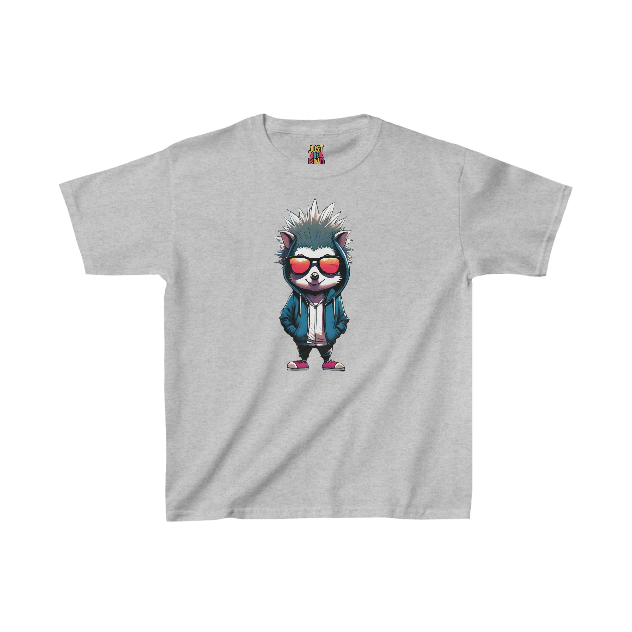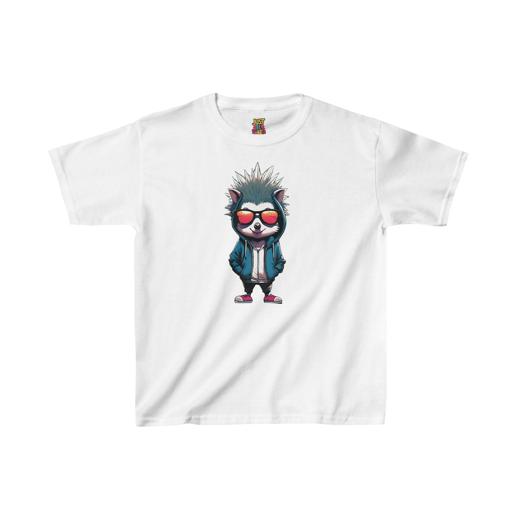The kids heavy cotton tee is perfect for everyday use. The fabric is 100% cotton for solid colors. Polyester is included for heather-color variants. The shoulders have twill tape for improved durability. The collar is curl resistant due to ribbed knitting. There are no seams along the sides.